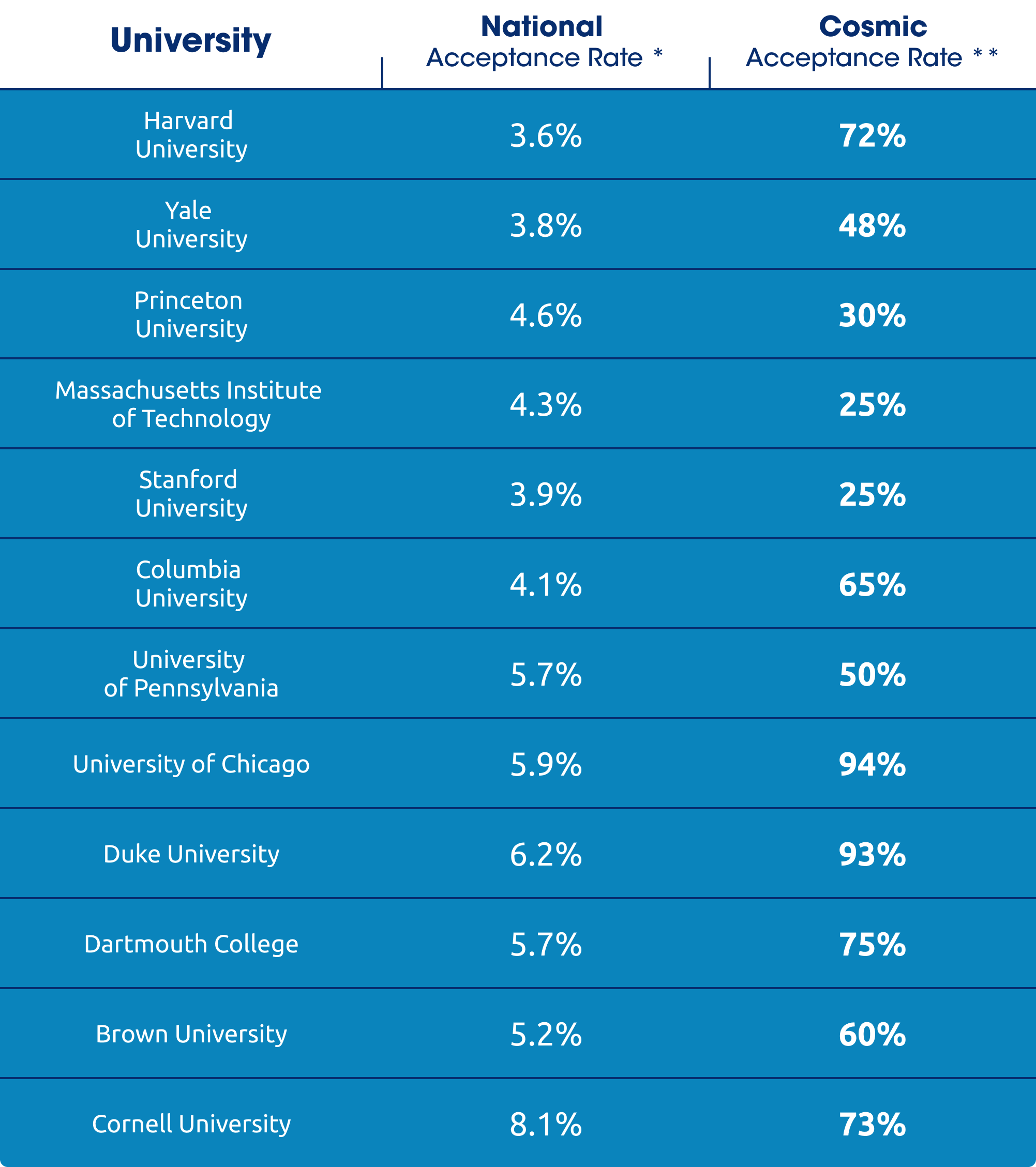 ** These statistics were calculated using acceptances that our consultants helped students receive from these schools, excluding students who did not comply with our recommendations.
